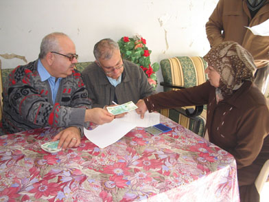 أشرف على عملية التوزيع الحاجة عائشة شبارو حيث قامت بفرز وتوضيب الألبسة والأحذية حسب المقاسات ووزعتها على الأُسر.