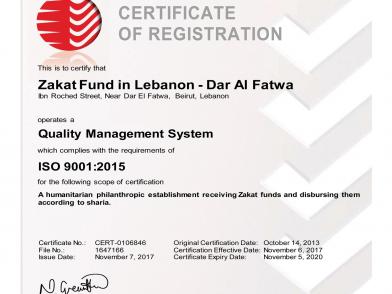 حاز صندوق الزكاة في لبنان ـ دار الفتوى في العام 2013م على شهادة الجودة العالمية الآيزو «ISO» نتيجة لأدائه المتقن وجودة خدماته ونجاح مشاريعه وحسن استغلال الموارد، ووضع الخطط الاستراتيجية لتحسين الأداء، ولمواءمة أعماله لأهم المعايير الدولية، ومنذ ذلك الوقت حافظ الصندوق على هذه الشهادة بعد أجراء تدقيق داخلي من قبل ادارة الجودة، وآخر خارجي من قبل الهيئة التي تتابع المؤسسات التي حازت على شهادات الآيزو، والتي تصدر بعد كل تدقيق شهادة جديدة تبين أنه أهل لها بكل كفاءة وتميز.